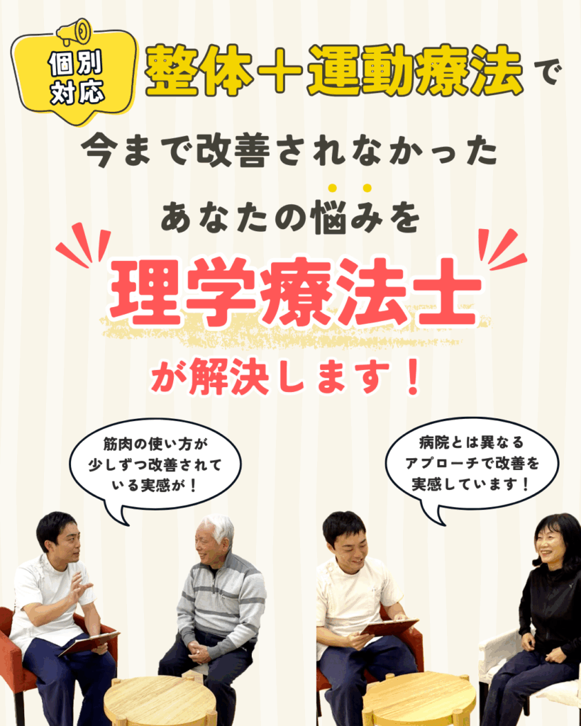 整体で体を整えるだけでは一時的な変化にとどまります。本当に大切なのは「正しい体の使い方を脳に覚えさせること」これを実現するのが理学療法士による専門的な運動療法です。